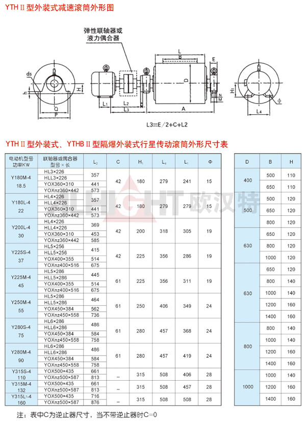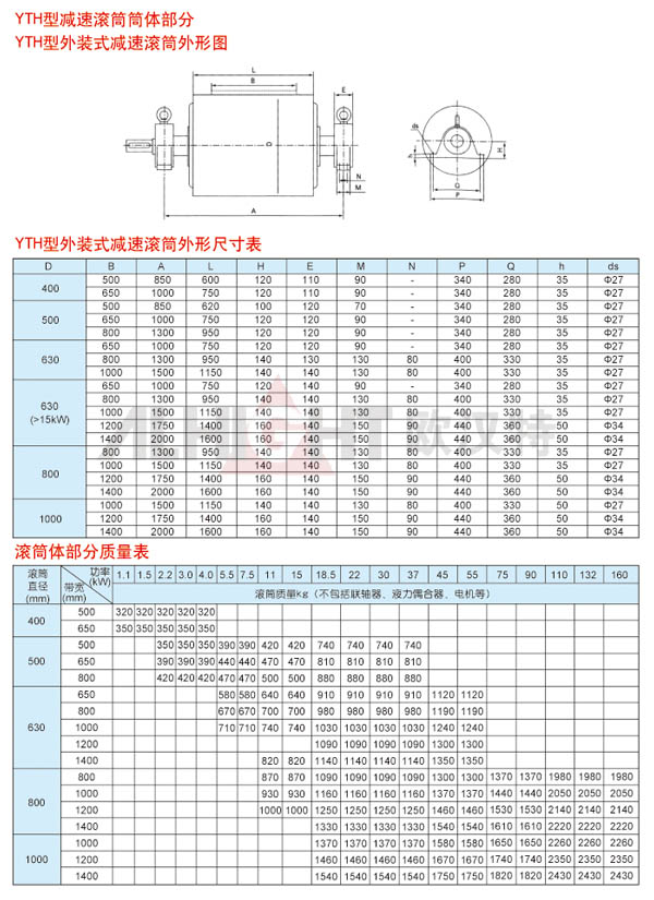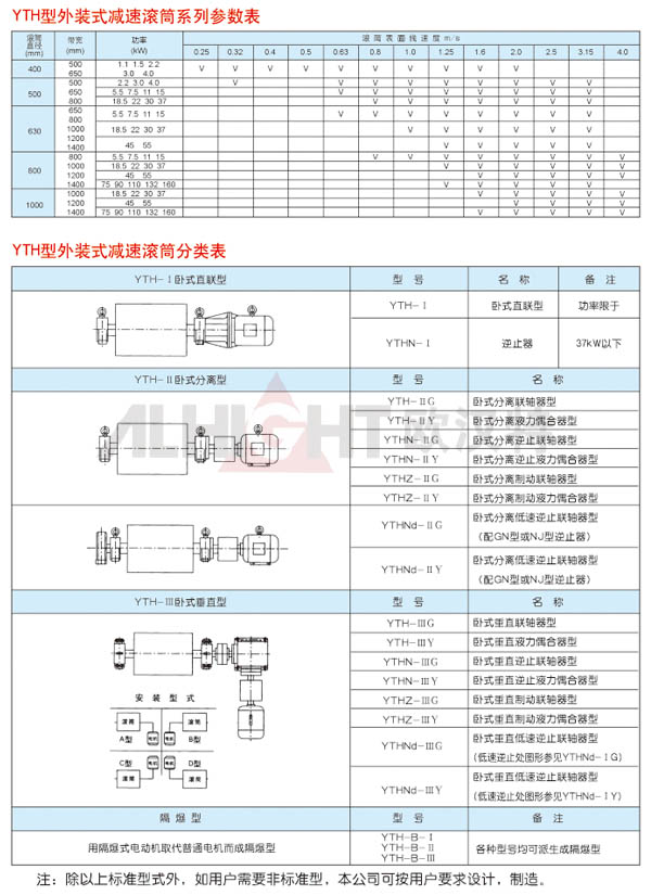 YTH型外裝式減速滾筒,電機功率為55kw,滾筒表面線速度2.5m/s,帶寬1000mm,筒徑800mm,低速軸逆止,采用隔爆型電機,液力偶合器聯接的臥式分離型減速滾筒。