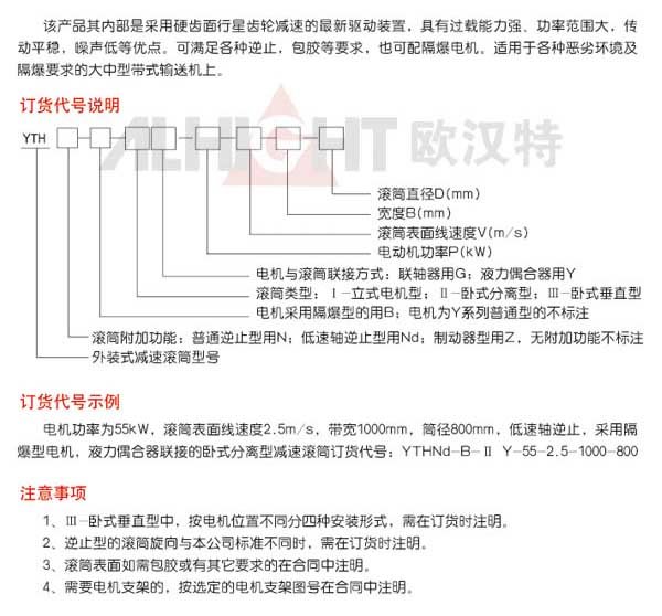淄博歐漢特電動滾筒有限公司生產的YTH型外裝式減速滾筒,是內部采用硬齒面行星齒輪減速的最新驅動裝置,其優(yōu)點是過載能力強、功率范圍大,傳動平穩(wěn),噪聲低。能夠滿足各種逆止,包膠等要求,也可以配隔爆點擊??梢赃m用于各種惡劣環(huán)境及用于隔爆要求的大中型帶式輸送機上。
